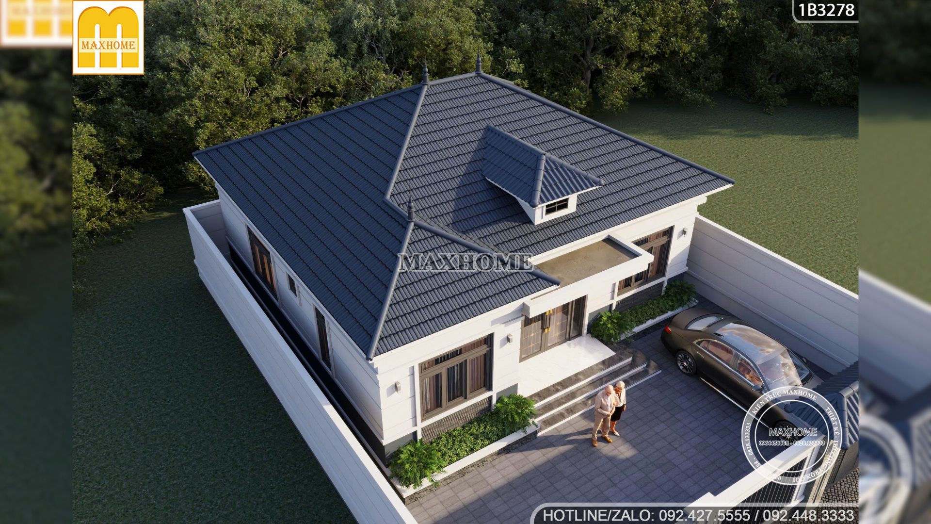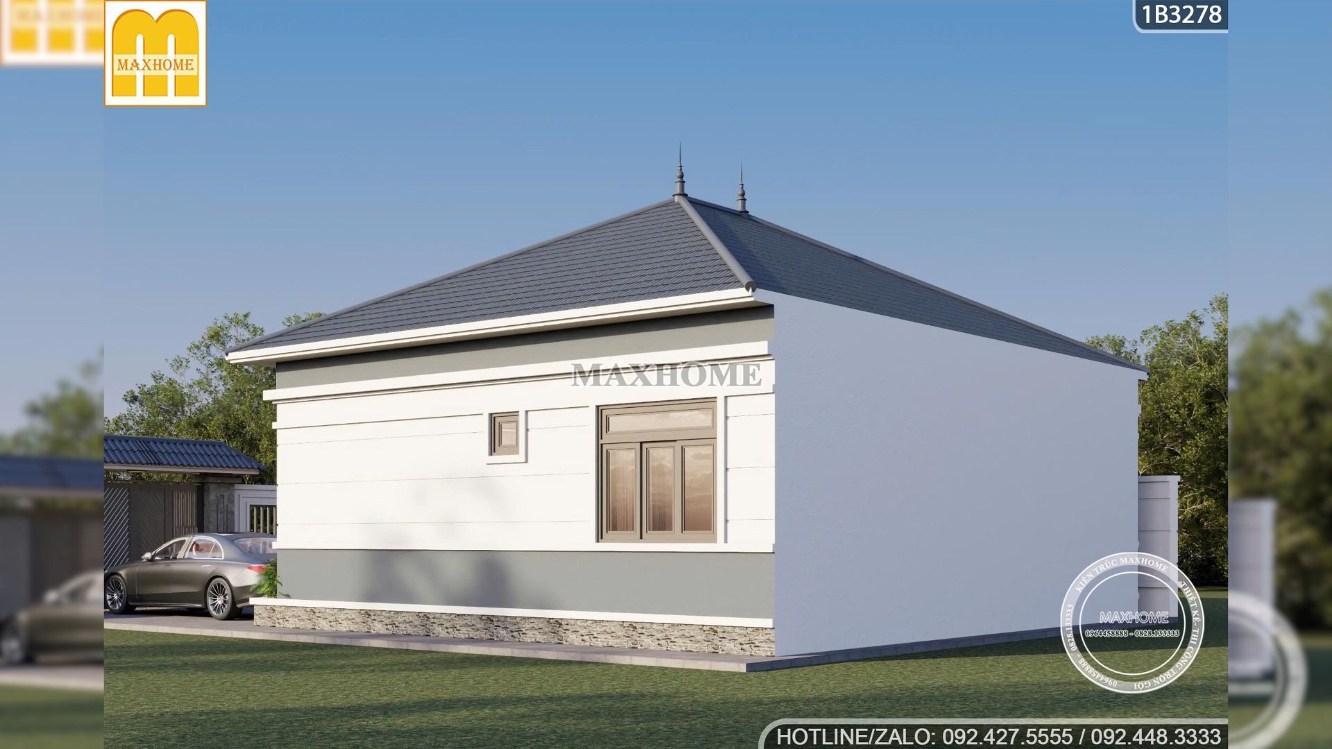 Một trong những yếu tố quan trọng nhất tạo nên linh hồn và vẻ đẹp thanh thoát cho mẫu thiết kế này chính là hệ mái Nhật màu xanh than đầy lịch lãm. Khác với mái Thái thường có độ dốc lớn và nhọn, hệ mái Nhật của căn nhà cấp 4 108m2 được đội ngũ thiết kế Maxhome tính toán độ dốc vừa phải, tỏa ra các hướng để tạo nên một khuôn diện cân đối và vững chãi. Lớp ngói sóng màu xanh đậm mát mẻ, dễ chịu giữa cái nắng của miền Bắc và khéo léo điểm nhấn màu sắc hoàn hảo trên nền tường trắng sứ.