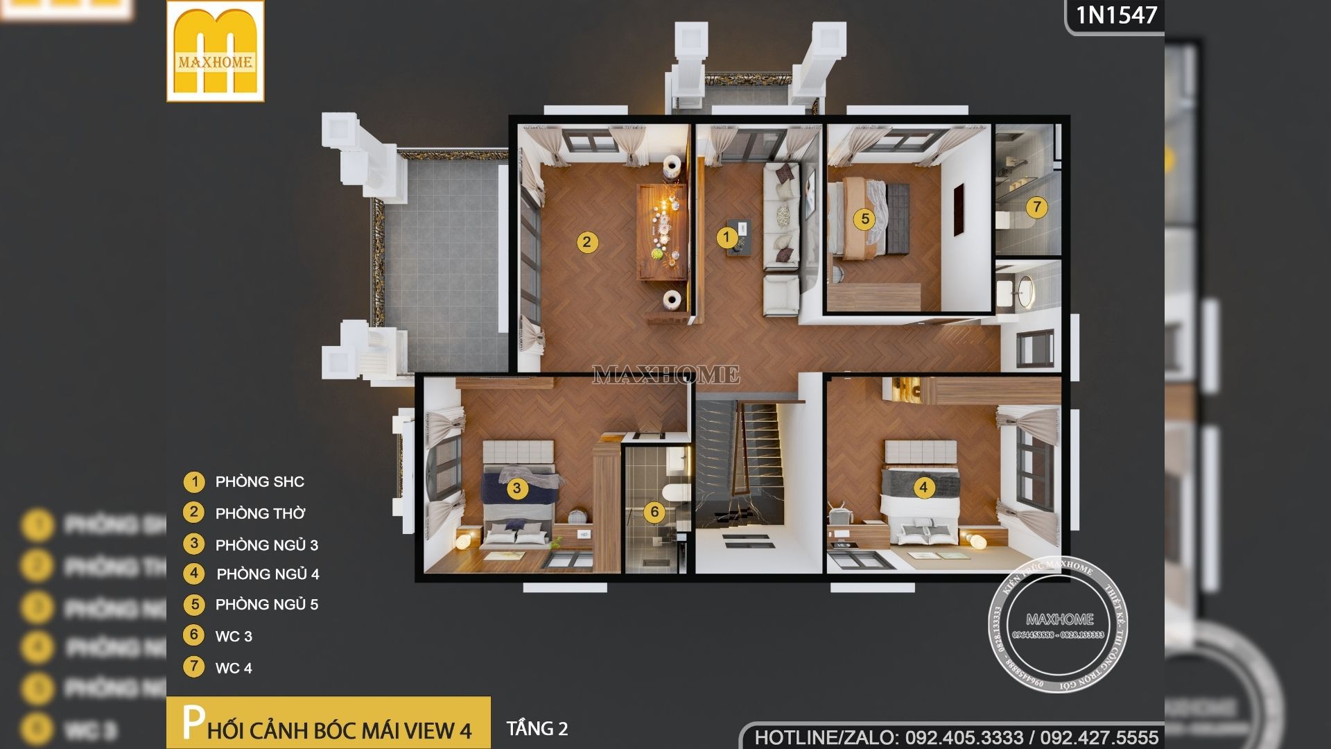Tiến lên tầng 2, không gian được phân chia tinh tế để ưu tiên cho việc nghỉ ngơi và thờ tự với sự xuất hiện của phòng thờ trang nghiêm rộng 15m2 nằm ở vị trí trung tâm hướng ra phía mặt tiền. Phía sau là khu vực sinh hoạt chung rộng 11m2 đóng vai trò là nơi gắn kết các thành viên trước khi bước vào 3 phòng ngủ riêng biệt. Điểm đặc biệt của tầng này chính là sân chơi với diện tích cực kỳ rộng rãi, mang đến không gian thư giãn ngoài trời lý tưởng để ngắm nhìn toàn cảnh khu vực xung quanh từ nhiều phía.