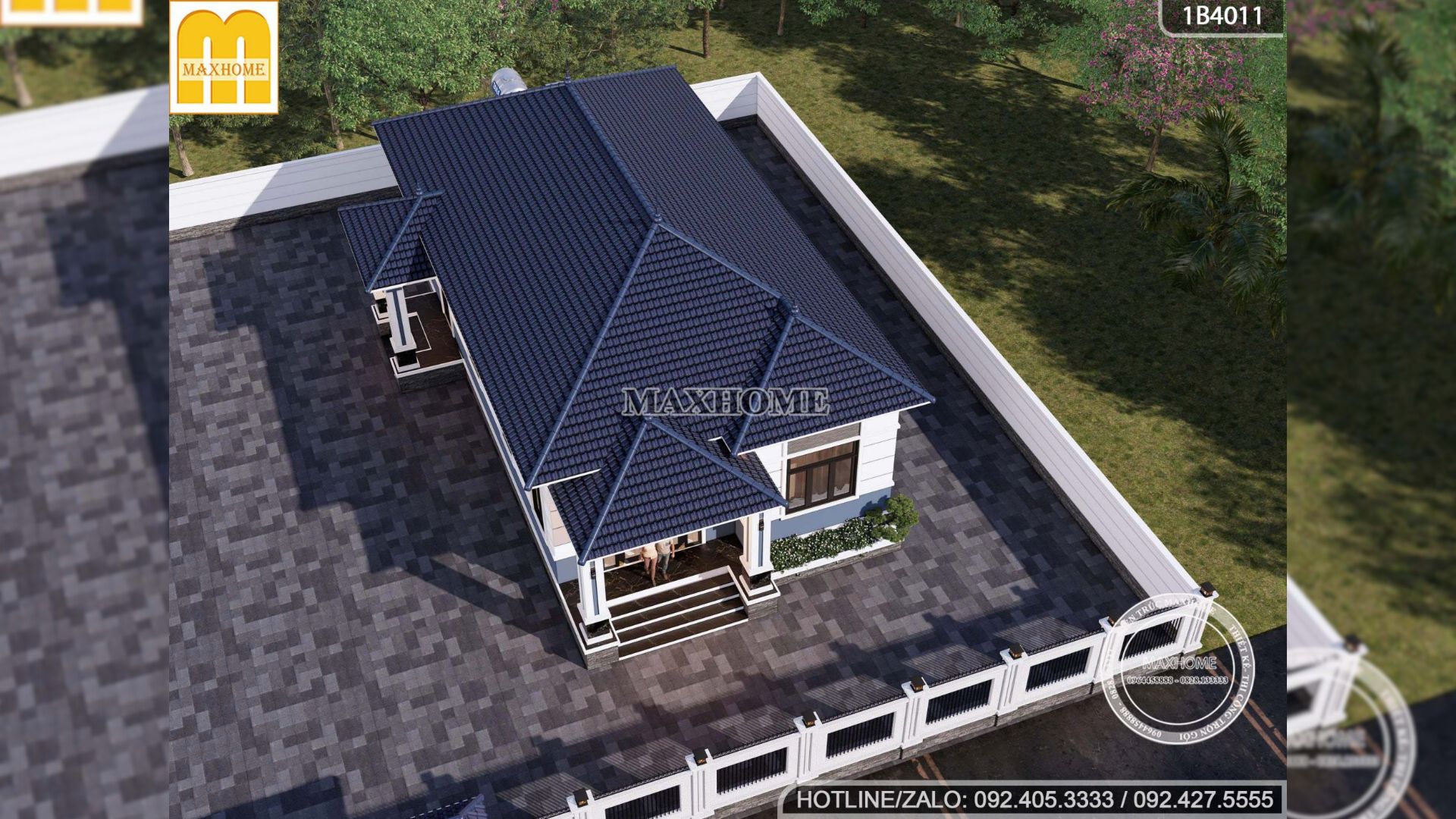 Từ góc nhìn trên cao, hệ mái Nhật của ngôi nhà hiện lên nổi bật với lớp ngói màu xanh than tinh tế. Gam màu này không chỉ tạo điểm nhấn sang trọng cho tổng thể công trình mà còn giúp phần mái hài hòa với cảnh quan xung quanh. Kiểu dáng mái Nhật với độ dốc vừa phải hỗ trợ thoát nước nhanh, chống ẩm mốc và nâng cao tuổi thọ công trình. Nhờ tính thẩm mỹ và công năng vượt trội, kiểu mái này đang được nhiều gia chủ ưa chuộng cho các mẫu nhà cấp 4 hiện đại.