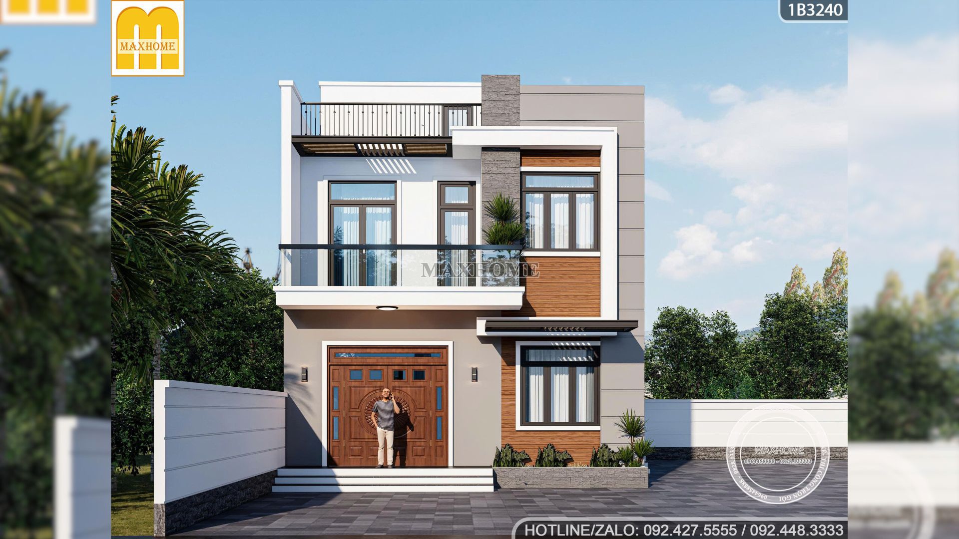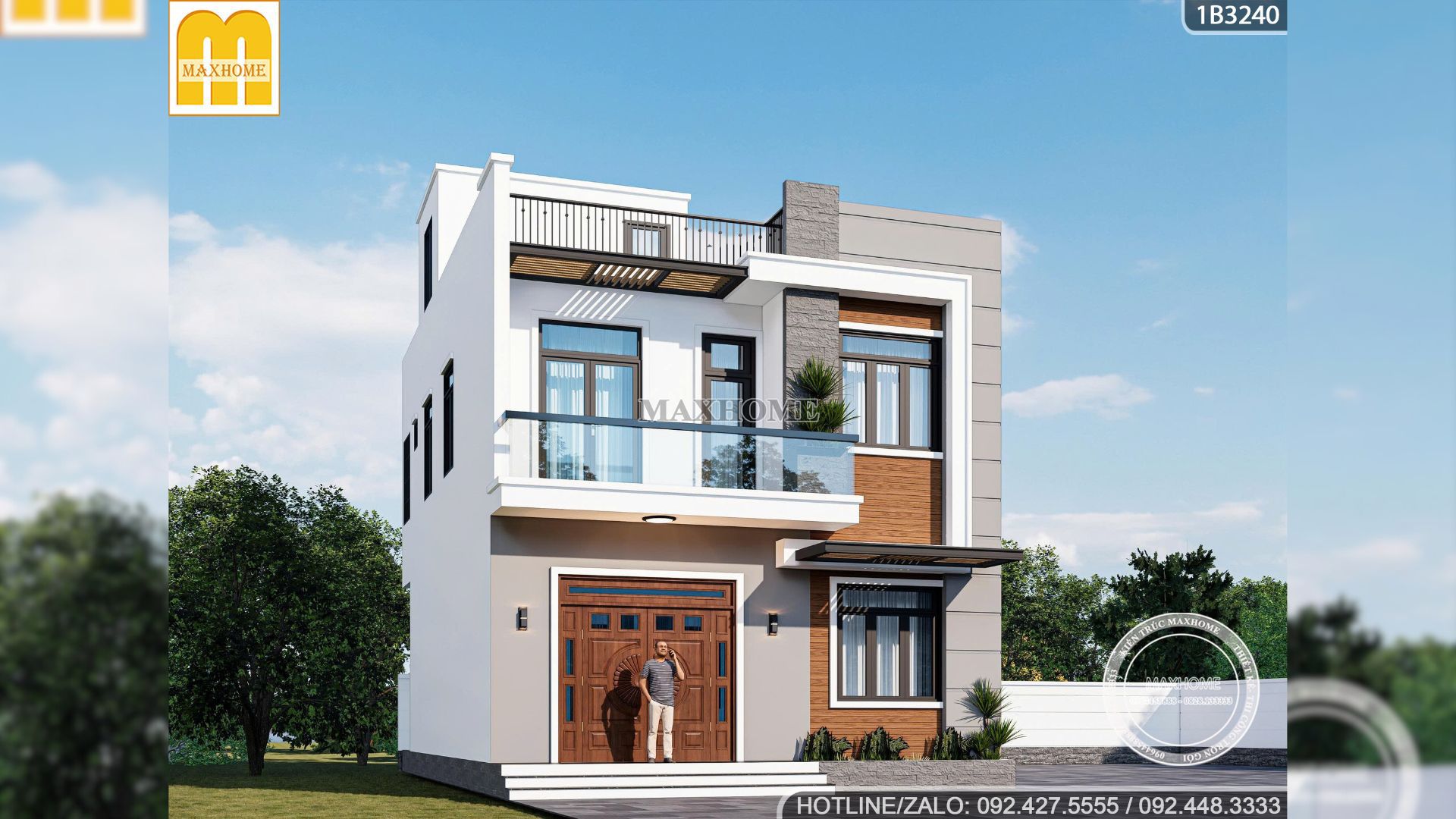 Maxhome đã khéo léo phối hợp giữa tông trắng tinh khôi và màu xám ghi trang nhã ở mặt tiền công trình. Bên cạnh đó, vị trí tường ốp gỗ nhựa ngoài trời để giúp mặt tiền thêm ấm áp, gần gũi và tự nhiên đồng thời hài hoà màu sắc với cửa chính bằng thép giả gỗ sang trọng. Sự tương phản giữa các vật liệu đã mang lại chiều sâu cho tổng thể khiến căn nhà 2 tầng 1 tum này trở nên khác biệt và có hồn hơn hẳn so với những công trình cùng phong cách.