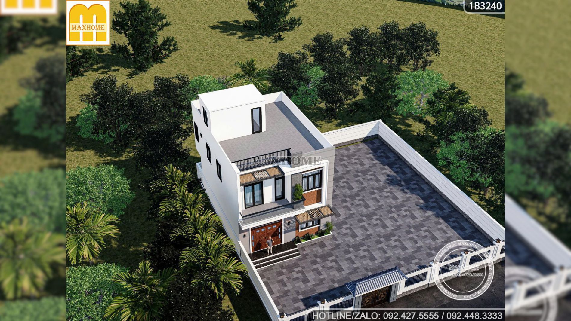 Khi quan sát tổng thể từ trên cao, có thể thấy ngôi nhà 2 tầng 1 tum này được đặt giữa khu vườn rộng bao quanh bởi hàng cây xanh tươi mát. Sân trước lát gạch xám sang trọng và sạch sẽ và rộng thoải mái để bố trí khu tiểu cảnh hoặc chỗ đỗ xe thuận tiện. Màu xanh của thiên nhiên hòa cùng gam trắng của ngôi nhà và màu nâu gỗ của mặt tiền, tất cả tạo nên một không gian sống chan hòa, dễ chịu, nơi gia chủ có thể thư giãn và tận hưởng cuộc sống yên bình mỗi ngày.