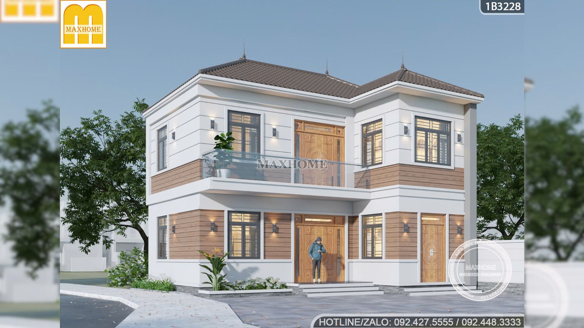Về màu sắc, ngôi nhà 2 tầng nổi bật với sự kết hợp giữa hai gam màu chủ đạo là trắng và nâu. Màu trắng được sử dụng làm nền giúp công trình trông sáng sủa, cao ráo và luôn giữ được vẻ thanh lịch theo thời gian. Điểm nhấn nằm ở các mảng sơn giả gỗ màu nâu được bố trí xen kẽ tạo cảm giác ấm áp và gần gũi đồng thời làm giảm sự đơn điệu của khối nhà.