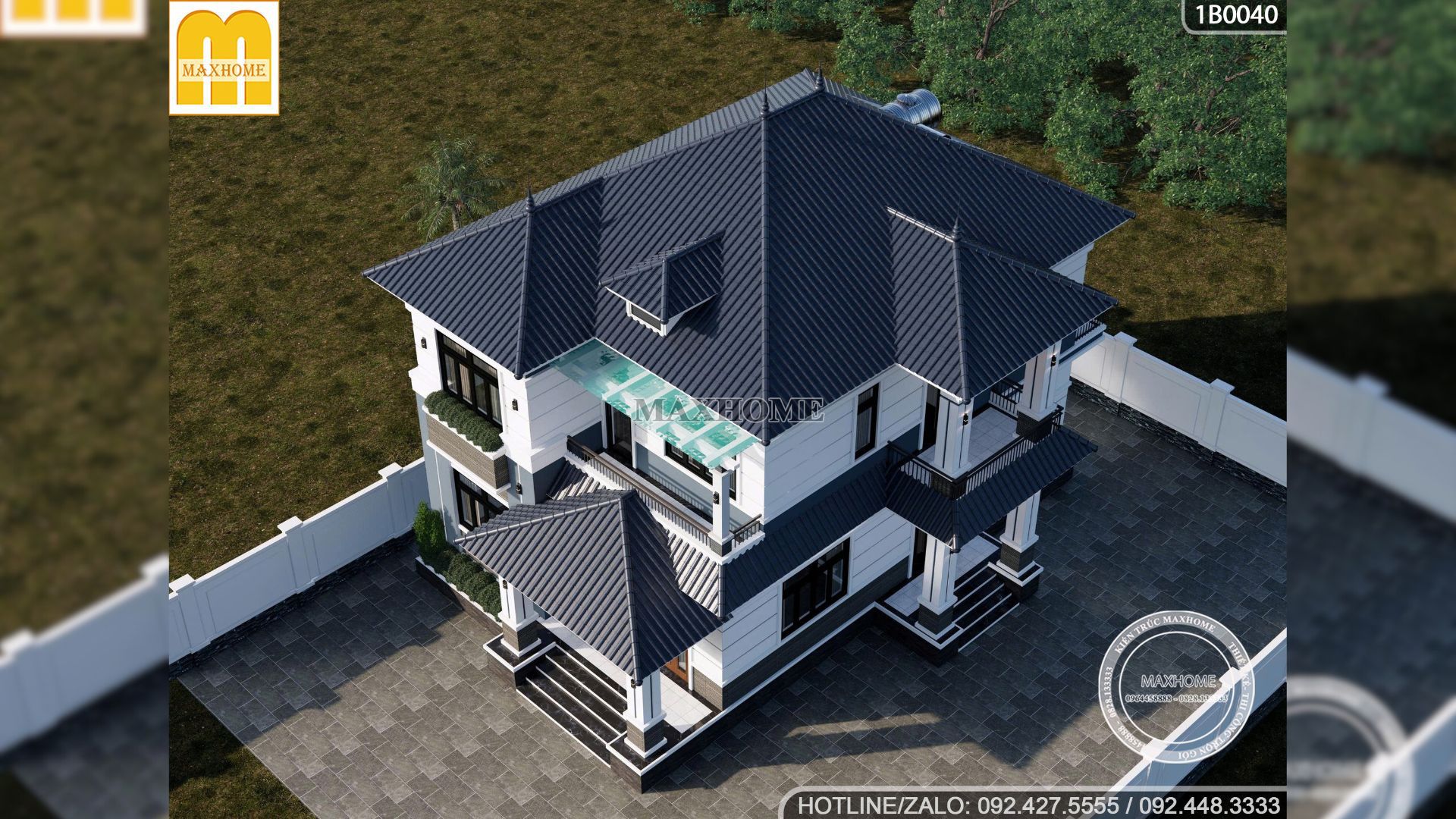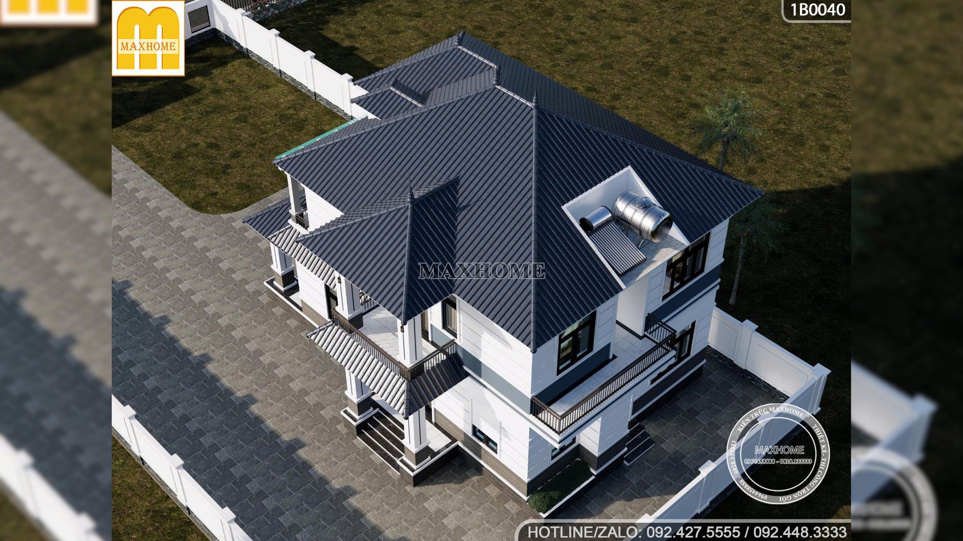 Mẫu nhà đẹp được thiết kế với chiều cao thông thuỷ tầng 1 là 3,9m, tầng 2 cao 3,6m và hệ mái Nhật cao 3m. Maxhome giảm dần chiều cao theo tầng để tối ưu tải trọng công trình và đồng thời nhờ có tỉ lệ này mà tạo ra cảm giác ngôi nhà vừa vặn, không quá cao nhưng vẫn đủ độ rộng và thoáng. Ngoài ra, hệ mái Nhật xếp lớp ngói xanh than là điểm khiến công trình khác biệt, nổi bật trên nền trắng và tạo sự cá tính, hiện đại. Trên mái còn có ô cửa kính lập là kích thước 800 x 400mm nhỏ xinh nhưng lại giúp mái nhà có thêm điểm nhấn thông thoáng.