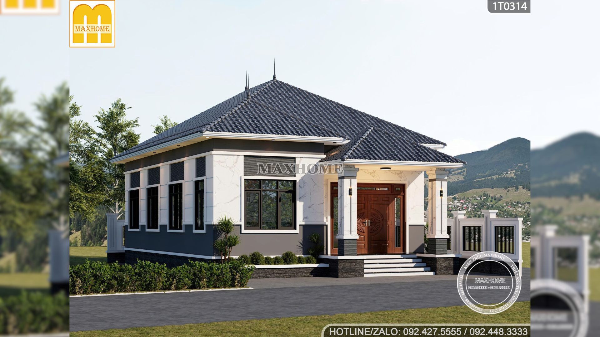 Một điểm nhấn đáng kể của thiết kế này là nền nhà được nâng cao 750mm và tạo nên 5 bậc thềm dẫn lối vào nhà. Mỗi bậc đều được ốp đá Granite đen ở phần mặt, trong khi phần cổ bậc dùng màu trắng sáng làm nổi bật sự tương phản và nhấn mạnh cảm giác cao ráo, bề thế. Độ dày mặt đá đạt 20mm giúp đảm bảo độ bền, độ chắc chắn và khiến tổng thể thêm phần sang trọng. Đây là chi tiết thể hiện sự chỉn chu của Maxhome trong việc xử lý từng hạng mục ngoại thất giúp ngôi nhà cấp 4 mặt tiền 11m này vừa đẹp vừa thực dụng.
