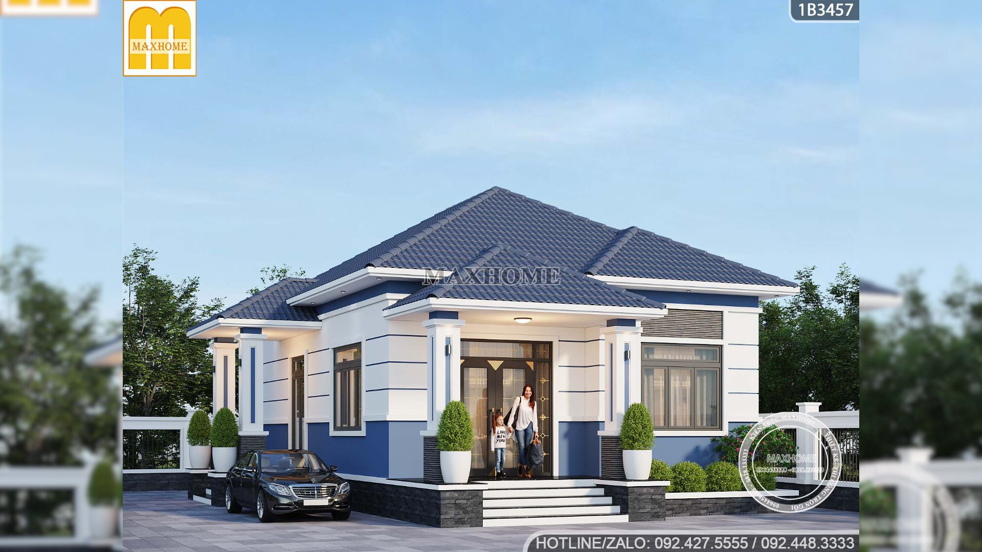 Màu sơn chủ đạo của căn nhà vườn này là màu trắng và xanh dương, sự đồng điệu giữa màu tường và màu mái giúp tổng thể hòa vào nhau nhẹ nhàng, không bị chói mà lại gợi cảm giác mát mẻ. Tường được soi chỉ với kích thước 30×15 chia đều cách nhau 480mm tạo nên hiệu ứng chiều sâu rất tự nhiên. Từng đường chỉ hiện lên rõ ràng nhưng không bị rườm rà đã góp phần định hình phong cách gọn gàng của mẫu nhà cấp 4 98m2 này.