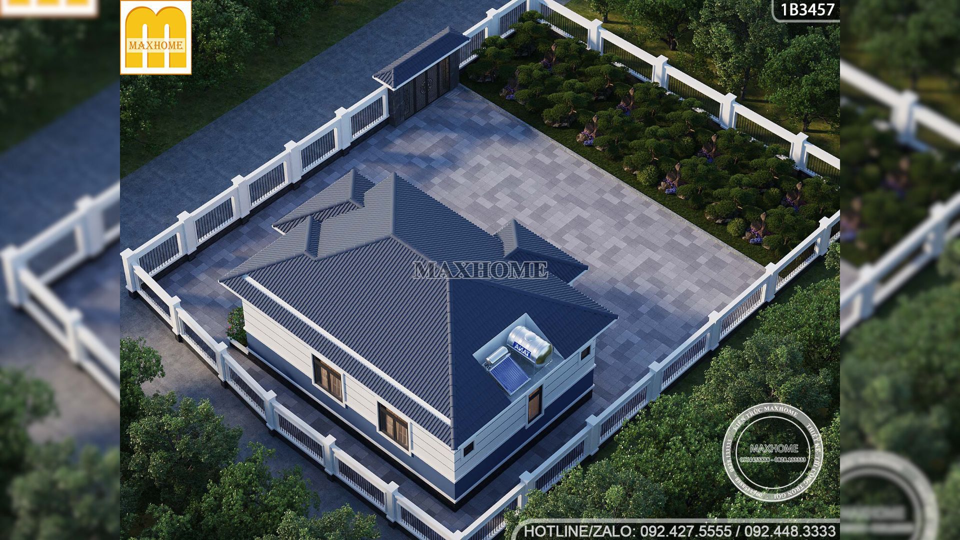 Hệ mái Nhật sử dụng mái ngói xanh dương đua ra đều ở cả hai bên, kiểu mái này không chỉ tôn dáng ngôi nhà mà còn giúp che chắn nắng mưa hiệu quả. Khi nhìn trực diện, tổng thể mái tạo thế cân đối và rất hài hòa với mảng tường màu trắng xanh phía dưới. Đây là kiểu mái rất hợp với khí hậu nông thôn miền Bắc vì sự bền chắc và đảm bảo tính thẩm mỹ lâu dài.