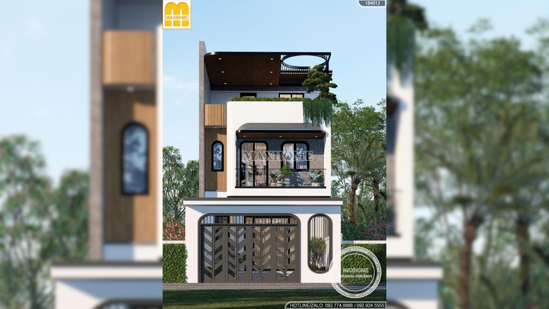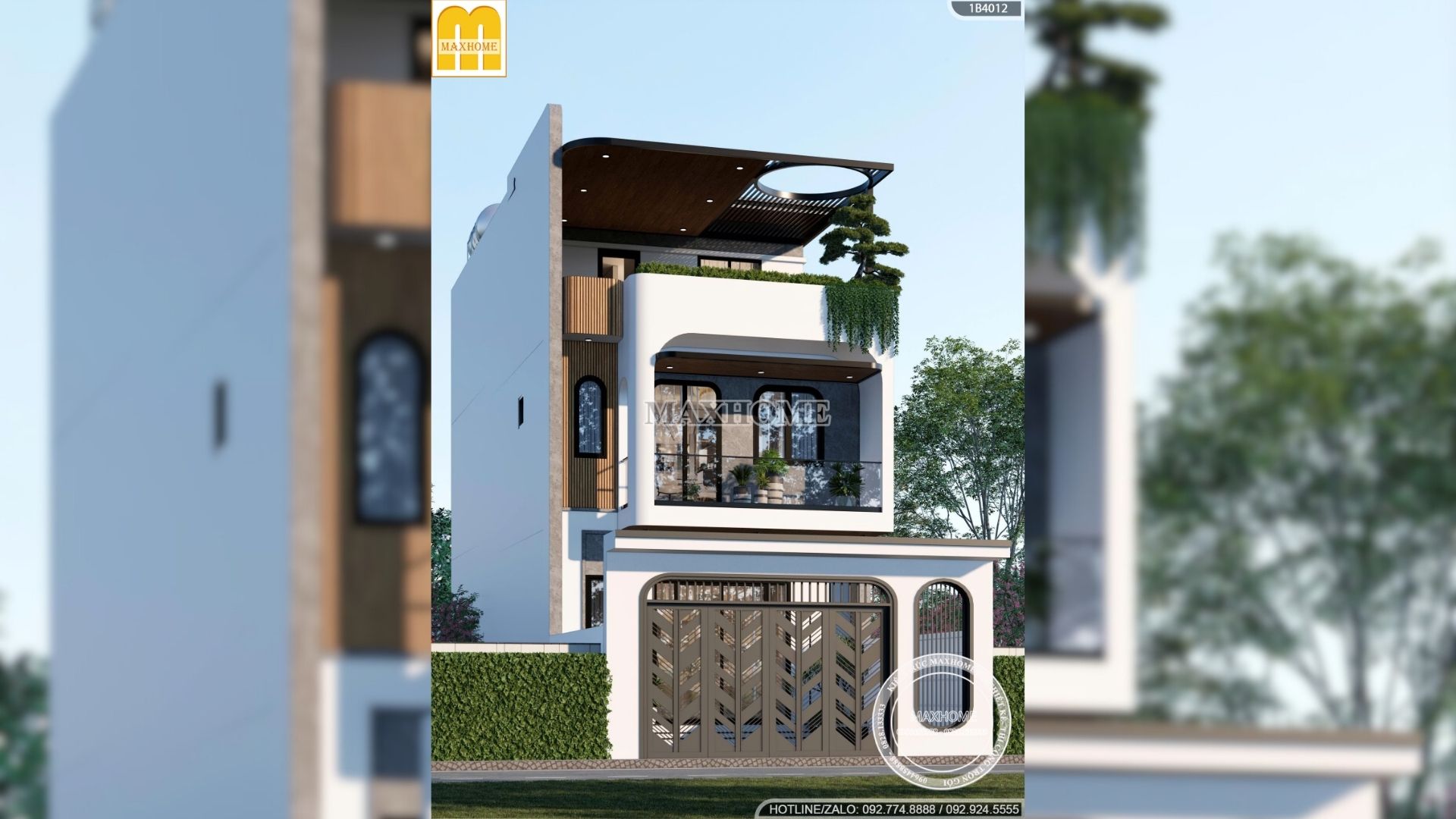 Bên cạnh đó, lam gỗ nhựa ốp khu vực bồn hoa được bố trí hợp lý, vừa đóng vai trò trang trí vừa tạo lớp chuyển tiếp mềm mại cho mặt tiền. Vật liệu này mang lại cảm giác ấm áp, gần gũi, đồng thời đảm bảo độ bền cao, hạn chế tác động của thời tiết. Sự kết hợp giữa màu sắc, vật liệu và chi tiết kiến trúc giúp công trình đạt được sự cân bằng giữa thẩm mỹ, công năng và giá trị sử dụng lâu dài, phù hợp với nhu cầu sinh hoạt và gu thẩm mỹ của gia đình hiện đại.