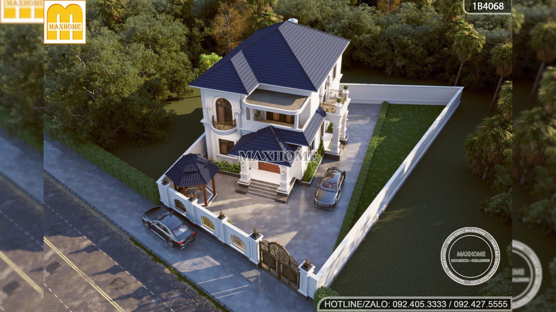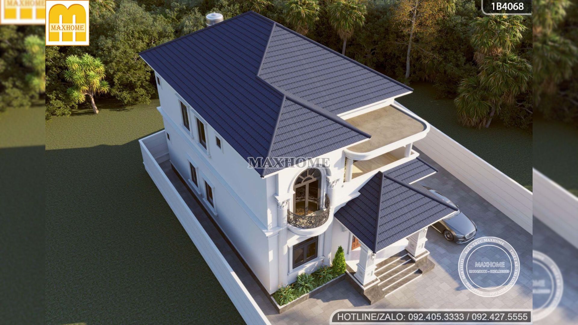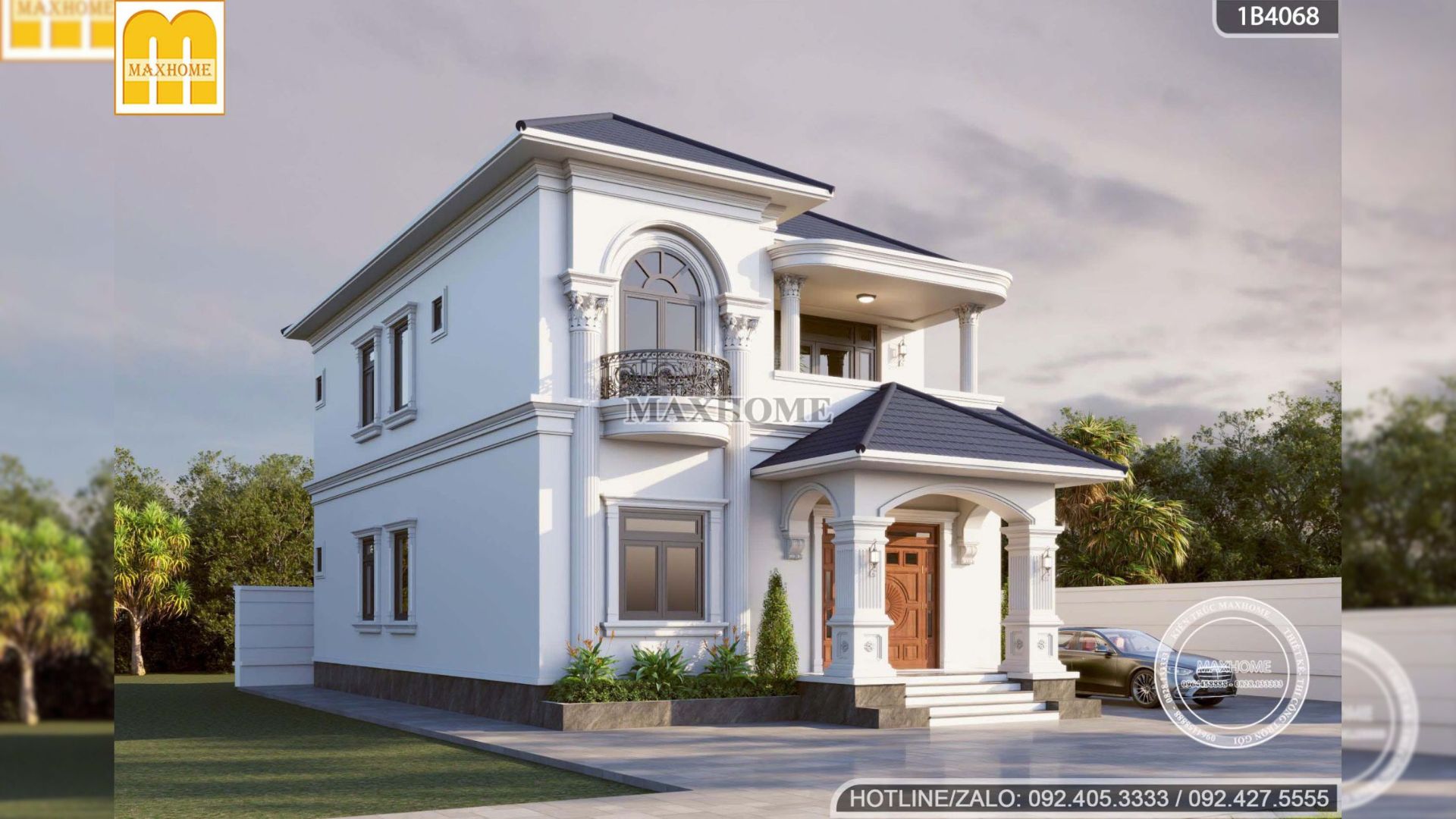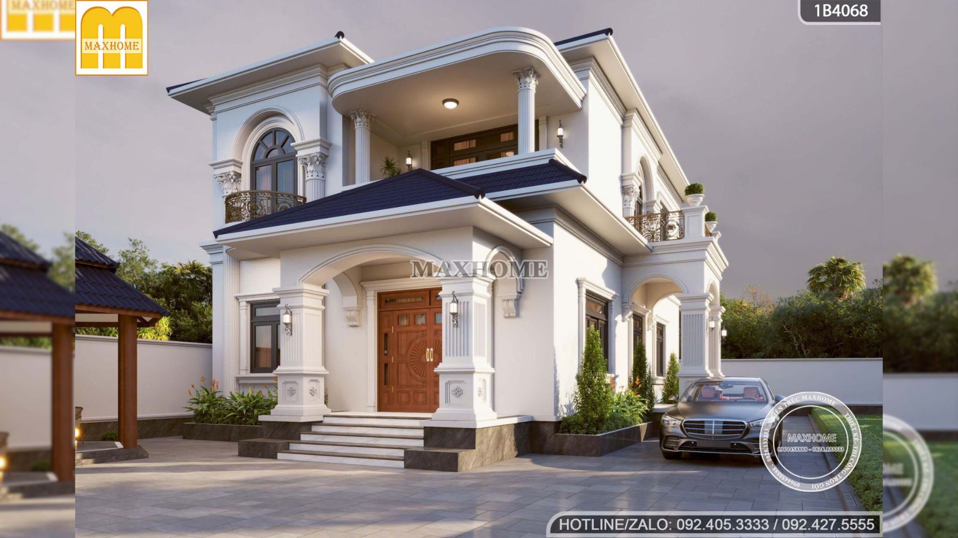 Mẫu biệt thự mái Nhật được thiết kế theo phong cách tân cổ điển, thể hiện rõ nét qua các hệ vòm mềm mại, đường phào chỉ tinh tế cùng những chi tiết đường cong bán nguyệt tại khu vực ban công tầng 2. Sự kết hợp hài hòa giữa các yếu tố kiến trúc này không chỉ tạo nên vẻ đẹp sang trọng, thanh lịch mà còn giúp tổng thể công trình trở nên cân đối, cuốn hút và giàu tính thẩm mỹ.