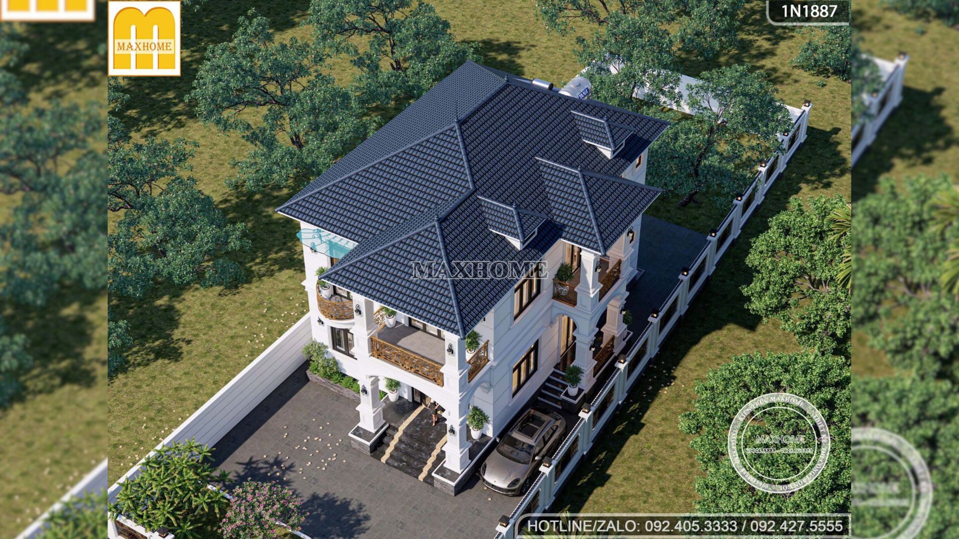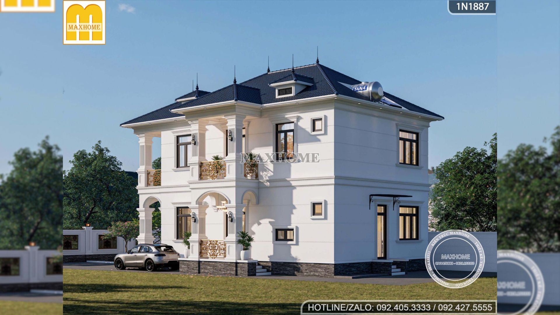 Hệ mái Nhật được thiết kế đua ra nhiều hướng, tạo nên những lớp mái xếp chồng tinh tế giúp tổng thể công trình trở nên bề thế và cân đối hơn. Trên mái còn được bố trí thêm chi tiết chuồng chim, vừa tăng chiều sâu kiến trúc, vừa tạo điểm nhấn độc đáo cho diện mạo ngôi nhà. Bên cạnh đó, hệ mái Nhật nổi bật với khả năng thoát nước nhanh nhờ độ dốc hợp lý, hạn chế đọng nước và rêu mốc. Ở phía sau mái, Maxhome còn sắp xếp gọn gàng khu vực đặt téc nước và hệ thống thái dương năng, đảm bảo tiện nghi sinh hoạt mà vẫn giữ được tính thẩm mỹ chung.