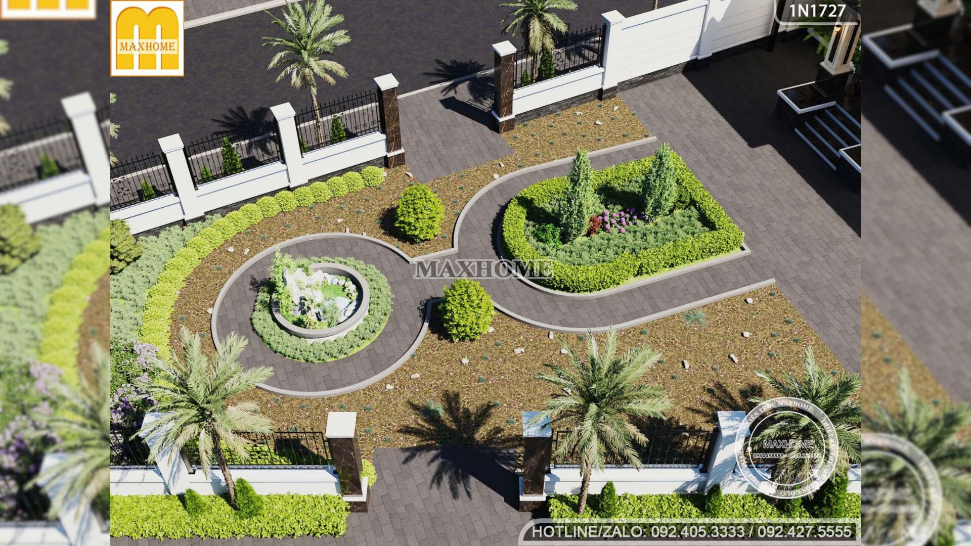 Bên cạnh thiết kế kiến trúc ngôi nhà, Maxhome còn chú trọng đến hạng mục sân vườn và tiểu cảnh nhằm tạo nên tổng thể không gian sống hài hòa. Từ góc nhìn này, có thể thấy hệ thống cổng và tường bao được bố trí bao quanh khuôn viên, kết hợp cùng nhiều mảng xanh và cây trồng đa dạng, giúp cảnh quan trở nên sinh động, thoáng mát và gần gũi với thiên nhiên hơn.