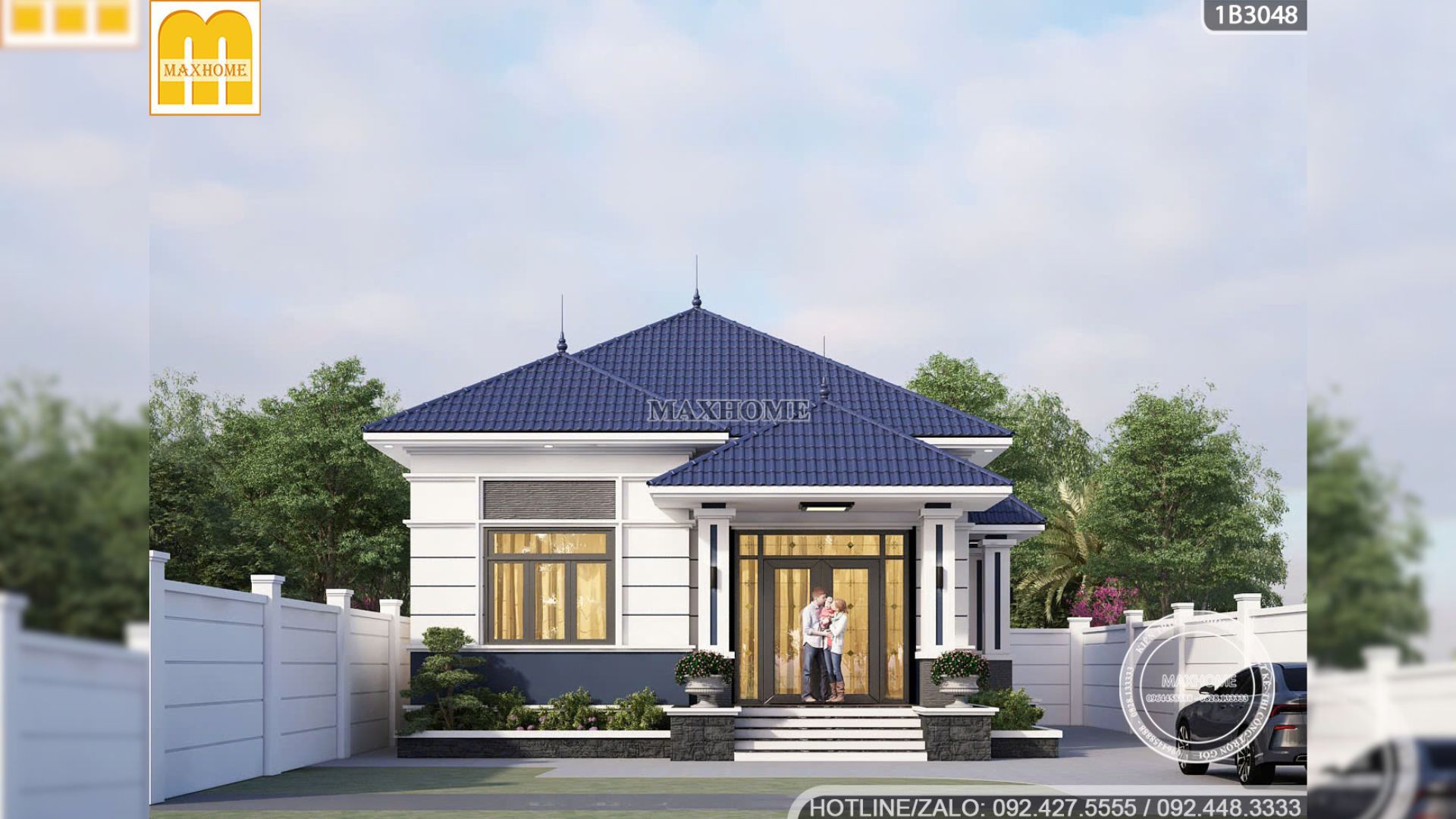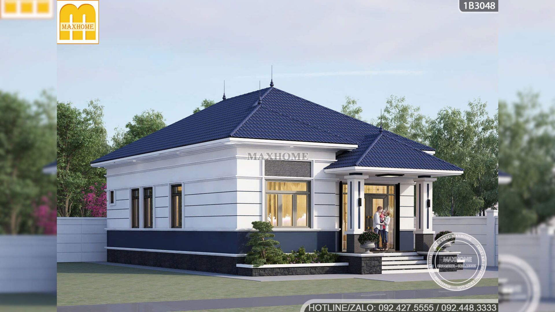 Nhìn từ bên ngoài, ngôi nhà cấp 4 3 phòng ngủ của anh Hưng mang dáng dấp hiện đại, trẻ trung nhưng vẫn giữ được nét gần gũi đặc trưng của kiến trúc Việt. Tông màu chủ đạo là trắng tinh khôi tạo cảm giác rộng rãi, sáng sủa kết hợp cùng phần chân tường sơn màu xanh dương đậm tương đồng với màu mái ngói giúp ngôi nhà trở nên nổi bật và có chiều sâu hơn. Đây là sự phối hợp màu sắc rất thông minh của Maxhome để tạo điểm nhấn thị giác và giúp phần chân tường sạch sẽ, chống bám bẩn hiệu quả.