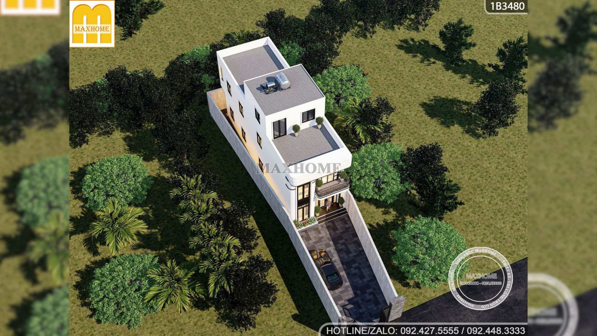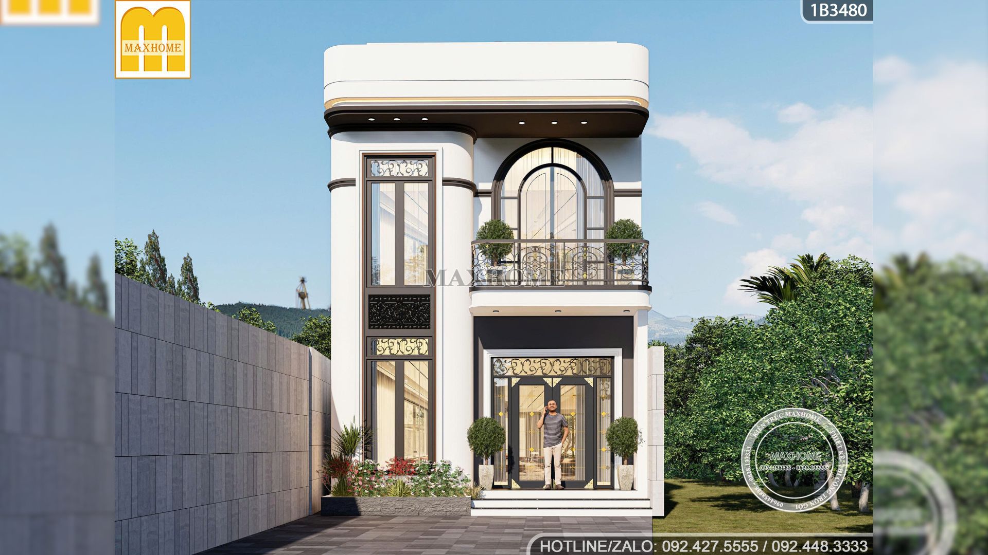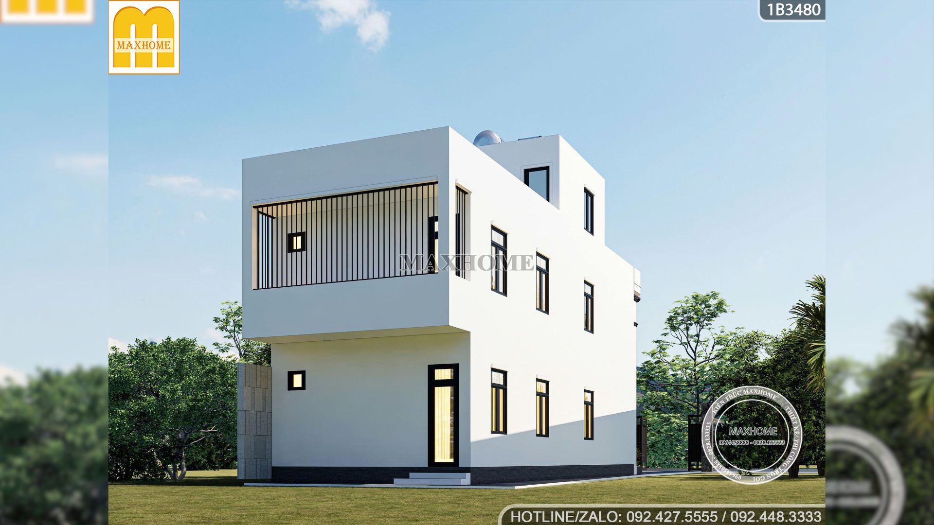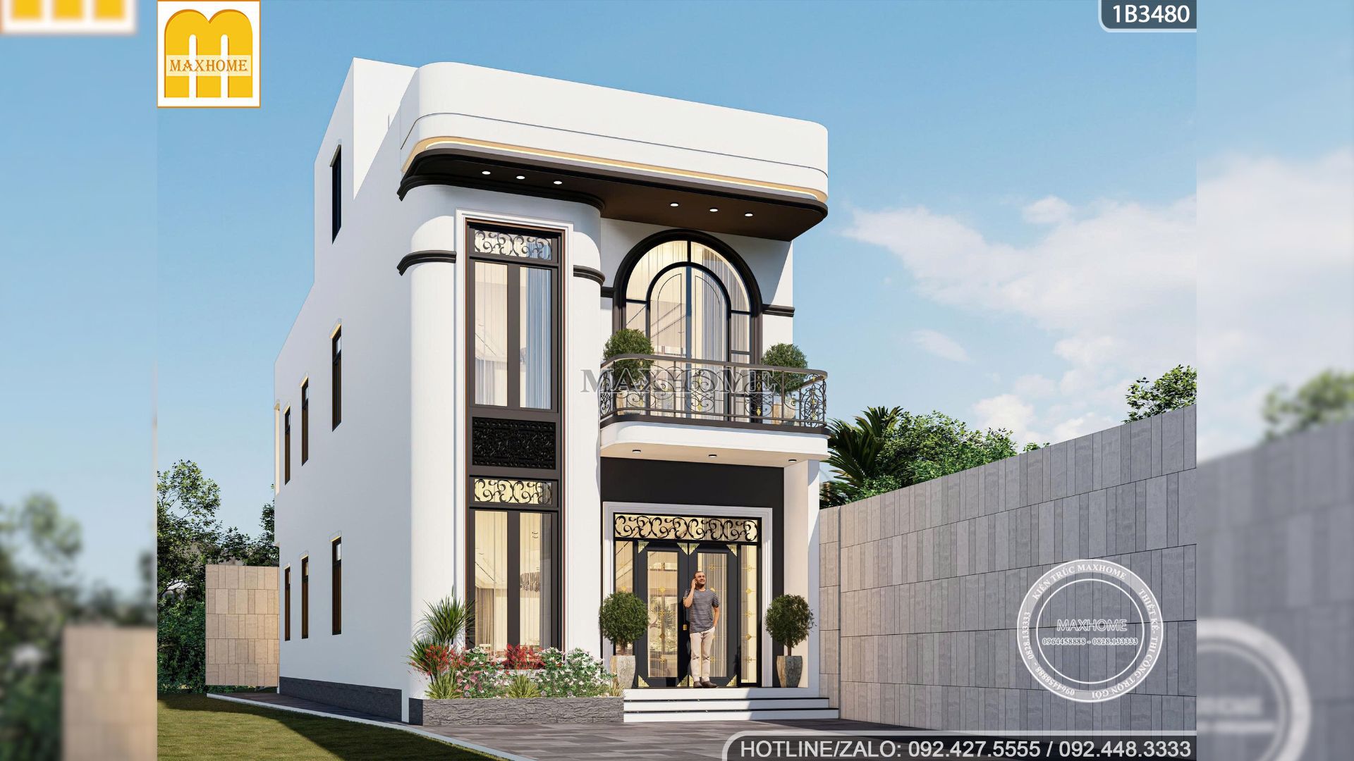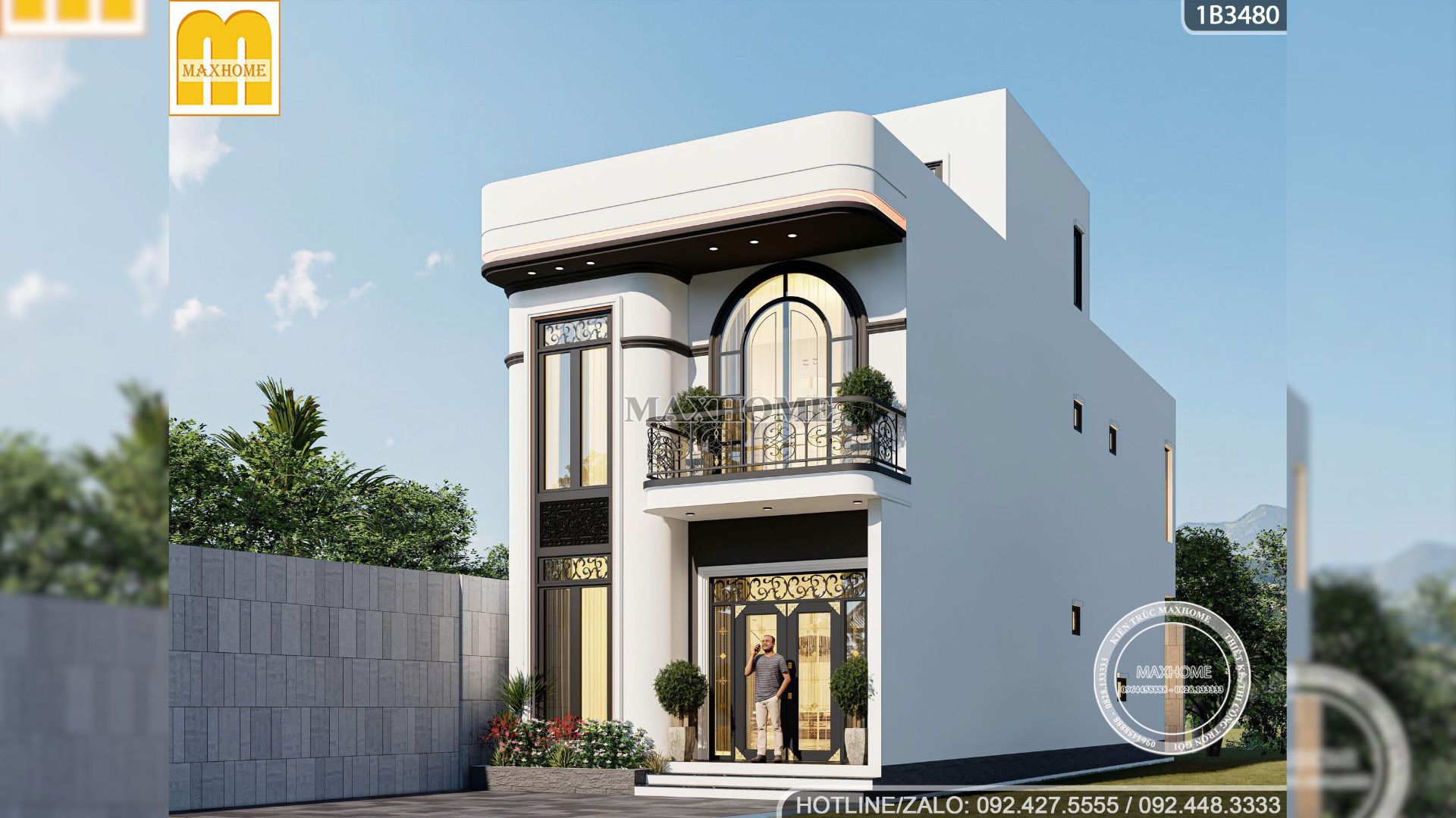 Màu sơn trắng ngoại thất là một trong những yếu tố khiến mẫu nhà đẹp trở nên hút mắt hơn. Những đường viền màu tối ở hệ cửa và lan can được dùng đúng chỗ tạo nên độ tương phản mạnh giúp hình khối rõ ràng và ấn tượng hơn. Ngoài ra, nền trắng kết hợp điểm nhấn đen luôn là công thức an toàn nhưng rất sang trọng, đặc biệt ở mẫu nhà phố 2 tầng 1 tum này, Maxhome đã vận dụng rất khéo léo để tôn lên vẻ hiện đại, tinh tế mà không gây cảm giác lạnh hay đơn điệu.
