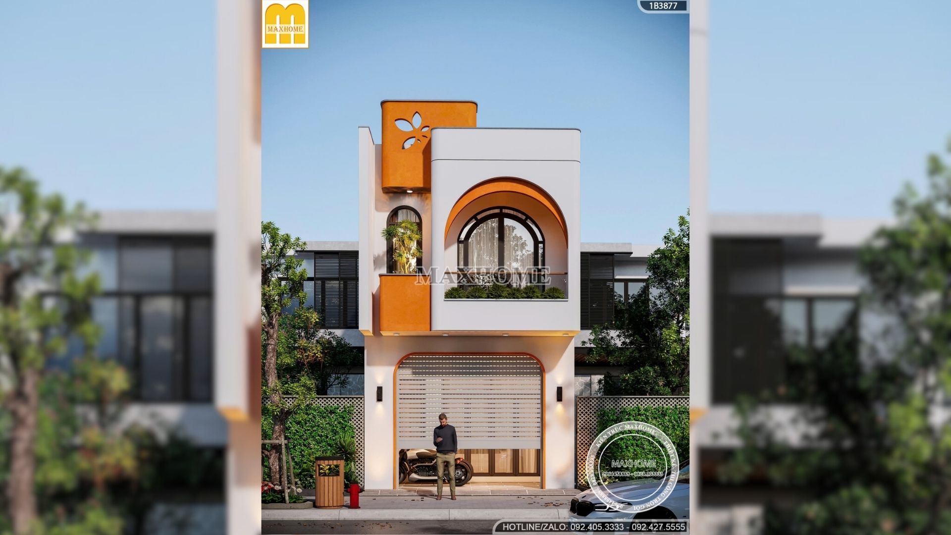 Gam màu chủ đạo của công trình là trắng kem kết hợp cam đất và đen nhấn. Màu trắng mang lại cảm giác sạch sẽ, hiện đại, giúp ngôi nhà luôn sáng và nổi bật trên phố. Màu cam đất được sử dụng có chủ đích, tập trung ở các mảng nhấn và chi tiết cong, tạo sự ấm áp và cá tính.