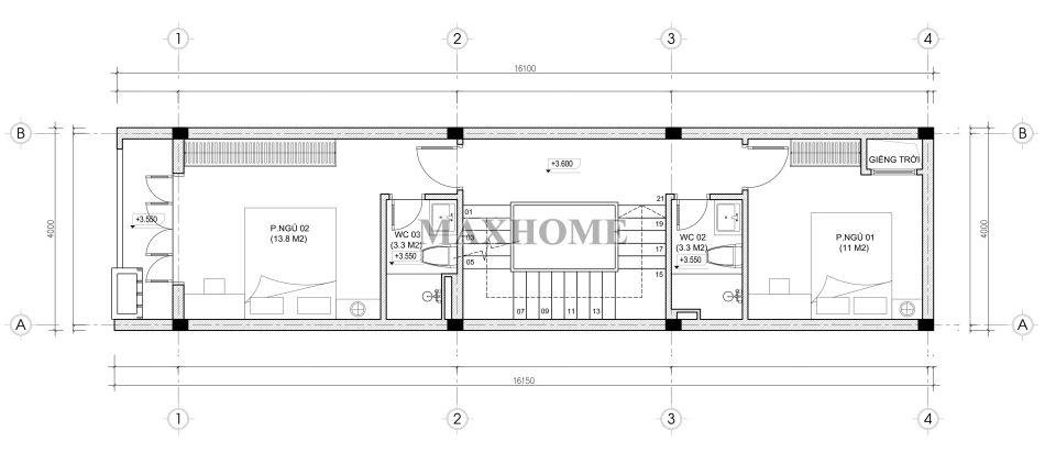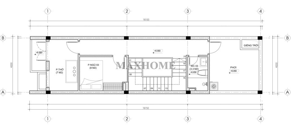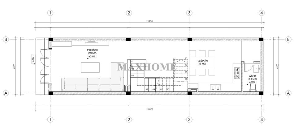 | Mặt tiền: 4m | Kích thước xây dựng: 4 x 15,9m |