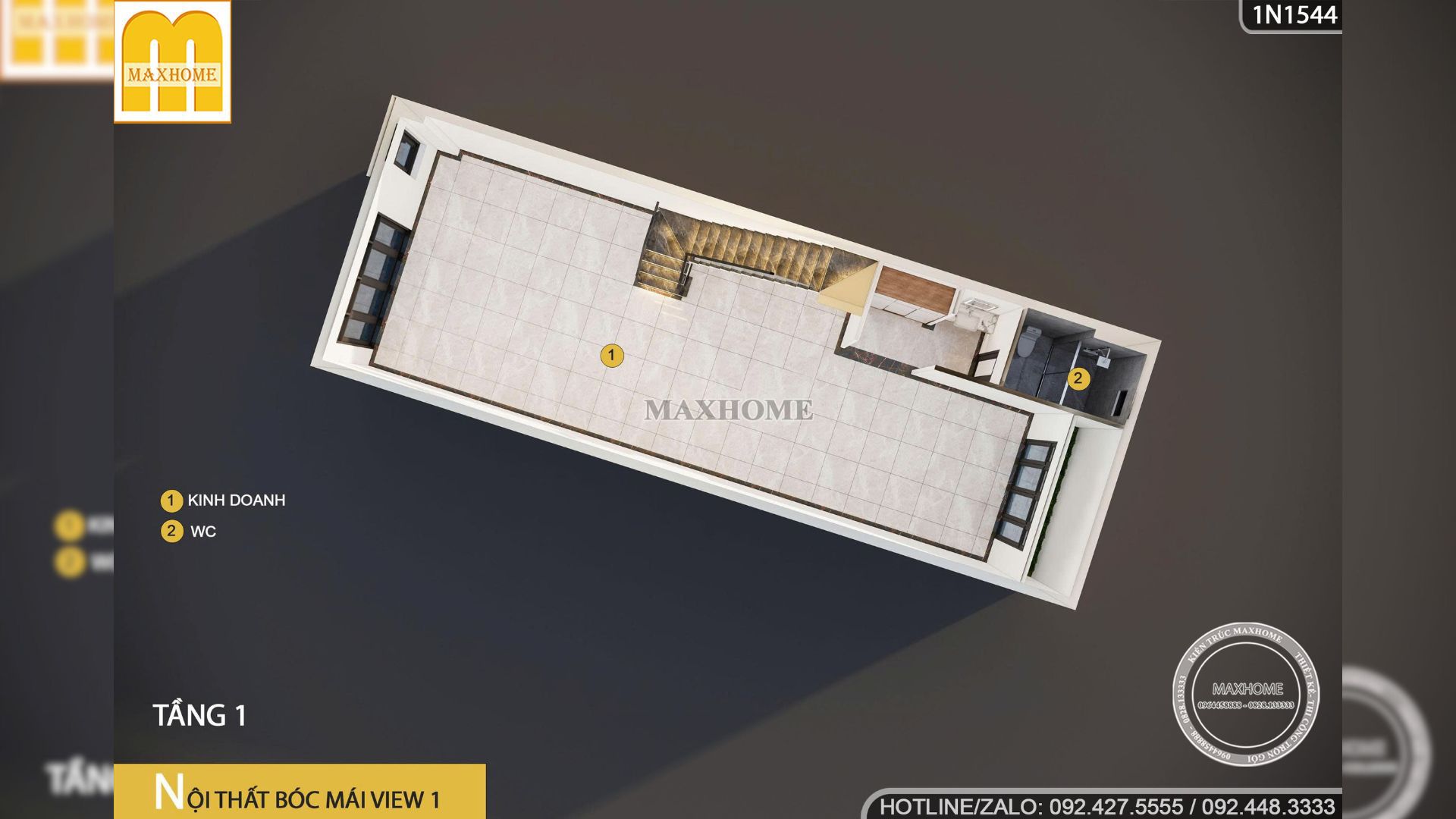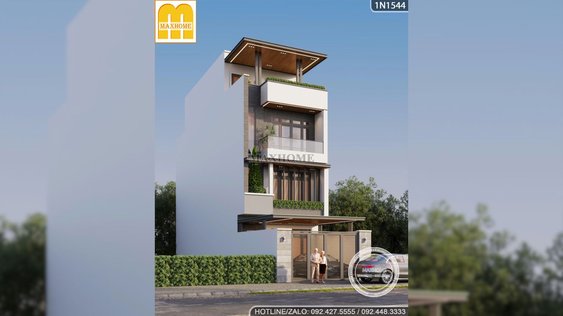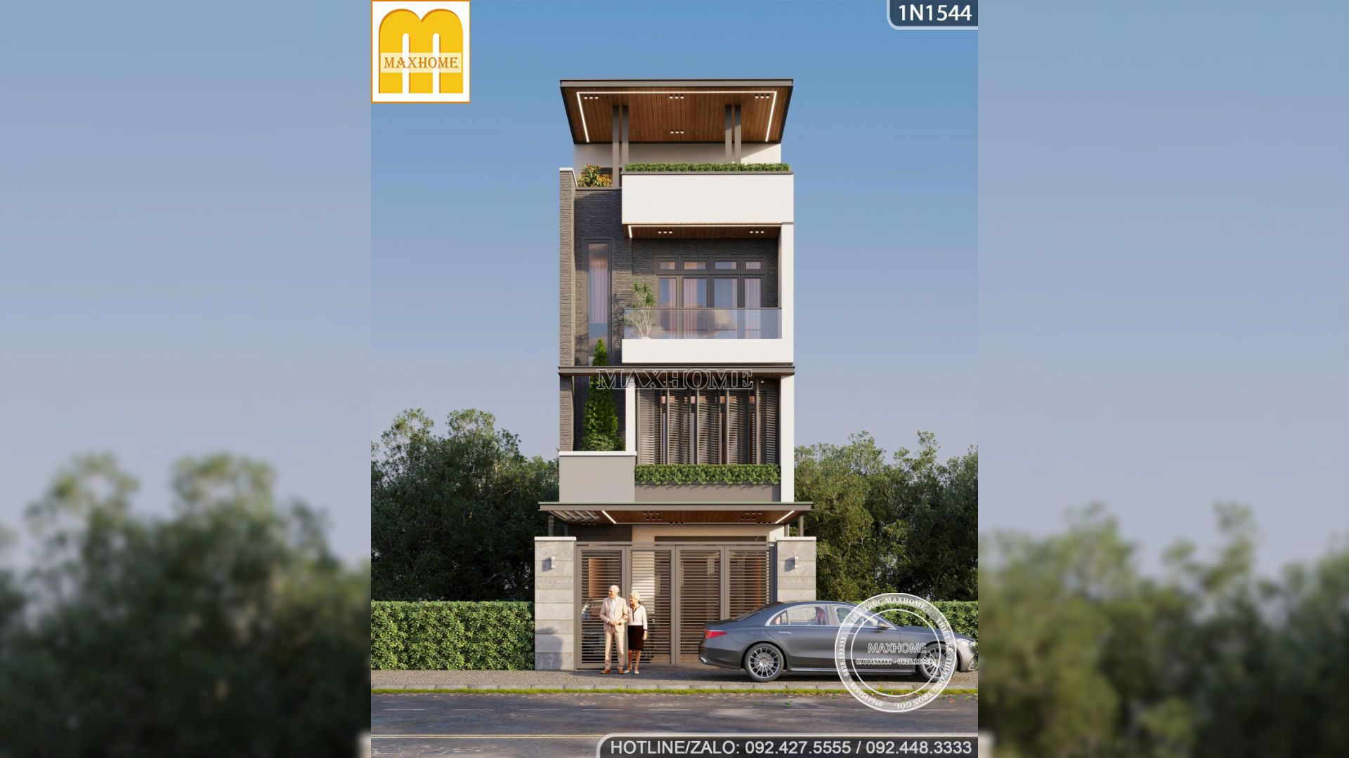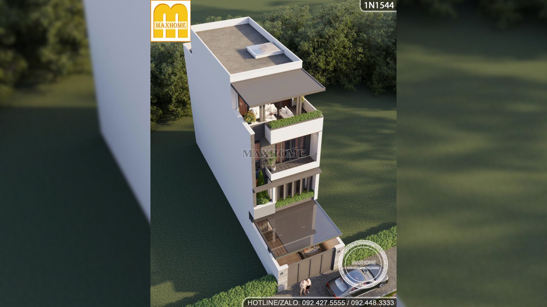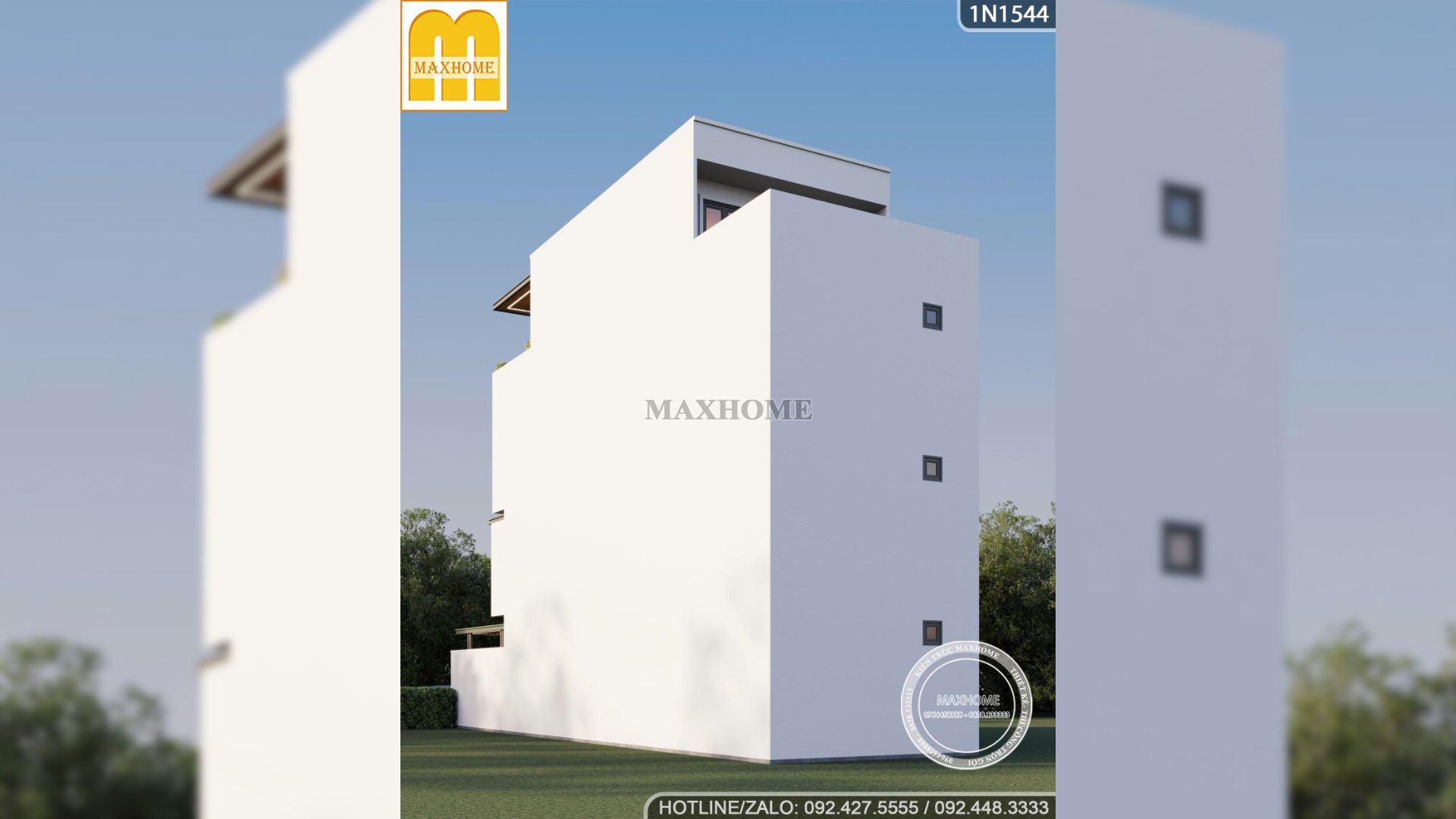 Ngôi nhà có kích thước xây dựng 6×20,3m khá lý tưởng cho khu vực đô thị, đội ngũ thiết kế Maxhome tạo hình khối vuông vức, xử lý gọn gàng mặt đứng giúp phân tầng rõ rệt để mang tới cảm giác ngôi nhà cao thoáng và có chiều sâu. Điểm nhấn mạnh nhất chính là bố cục mặt tiền theo hướng mở, sử dụng nhiều gạch ốp cũng như vật liệu kính cường lực cho cửa và ban công để đón sáng tự nhiên, làm cho công trình bừng lên vẻ hiện đại, sang trọng.