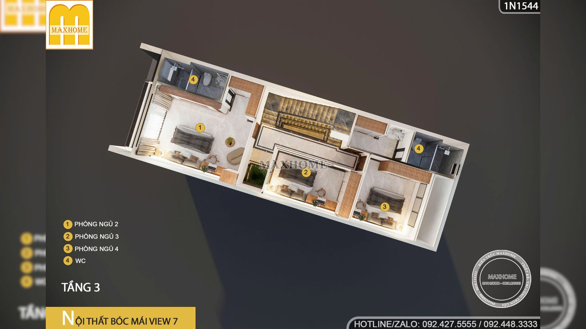 Tầng 3 là không gian nghỉ ngơi chính với 3 phòng ngủ được bố trí hợp lý để ai cũng có được sự riêng tư và thoải mái. Phòng ngủ 03 sẽ có diện tích nhỏ hơn do đặt đối diện cầu thang và phải để chừa khoảng hành lang đi lại, tuy nhiên căn phòng này vẫn có khoảng thông gió nhờ khoảng thông tầng nhỏ bên cạnh. Hai nhà vệ sinh được chia tách hợp lý để việc sử dụng vào giờ cao điểm buổi sáng hay buổi tối vẫn diễn ra thuận lợi mà không gây bất tiện cho các thành viên trong gia đình.