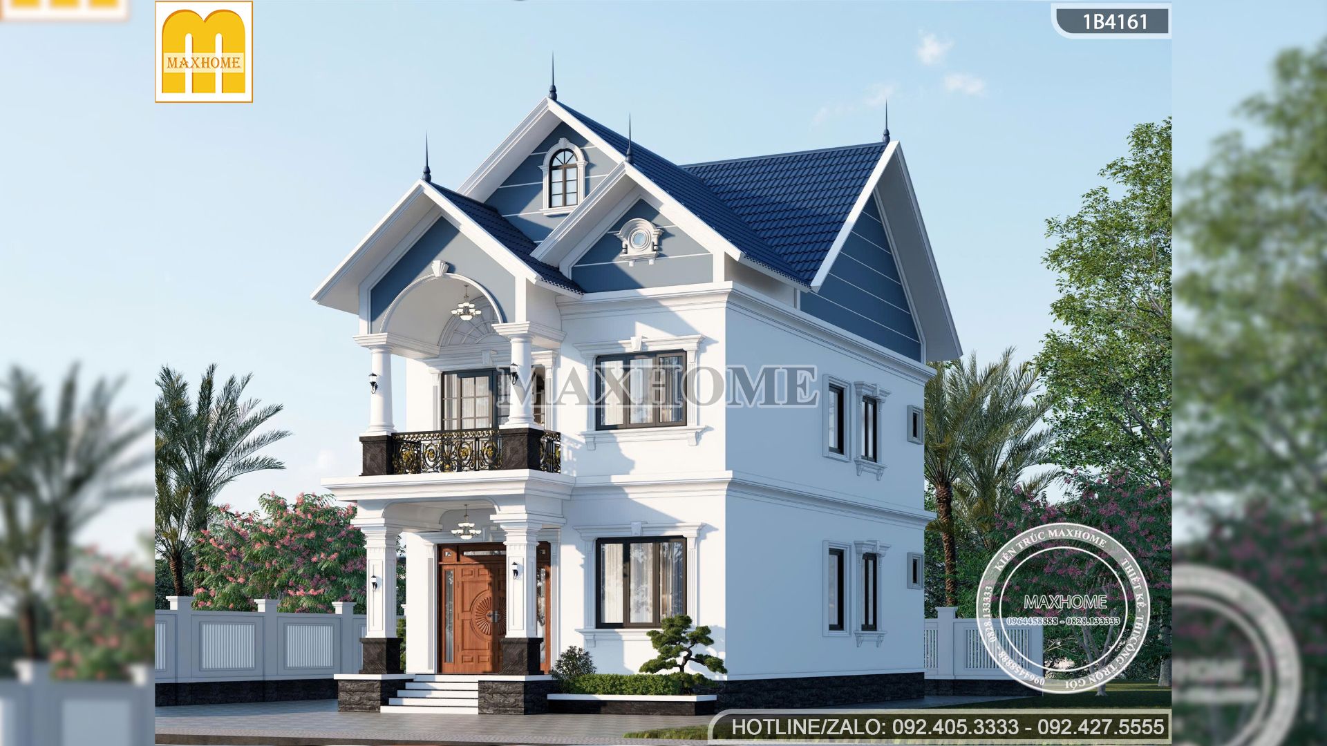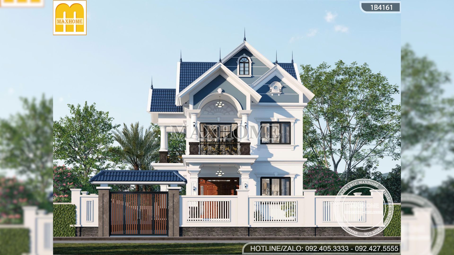 Ngôi nhà lựa chọn gam màu trắng – xanh làm chủ đạo, giúp tổng thể kiến trúc trở nên nổi bật và hài hòa theo từng mảng khối. Sắc trắng làm nền tôn lên các chi tiết phào chỉ, đường nét trang trí tinh tế, trong khi sắc xanh mang đến cảm giác trẻ trung, thanh thoát và dễ chịu.