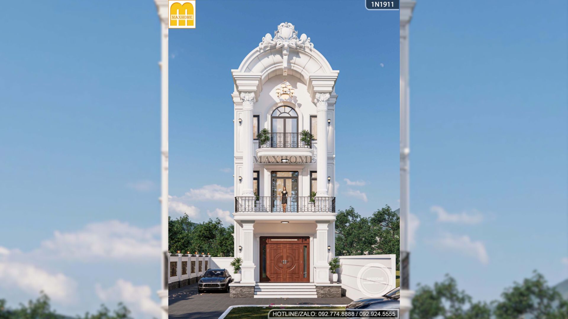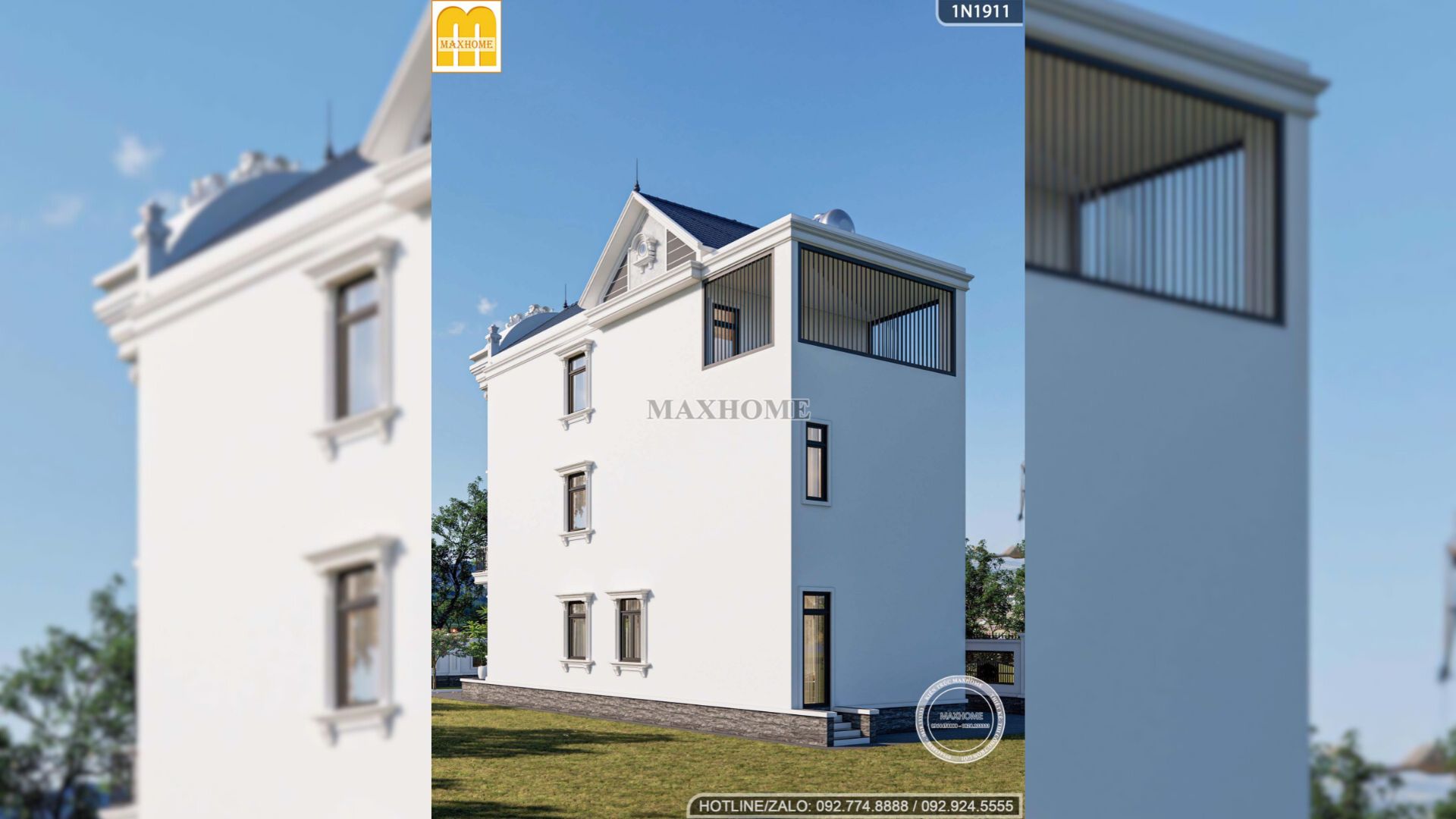 Tại khu vực tầng 3, ban công được thiết kế với đường nét mềm mại, uốn cong duyên dáng, kết hợp cùng hệ lan can sắt mỹ thuật tạo hình tinh xảo, góp phần làm nổi bật đặc trưng thanh lịch của phong cách tân cổ điển. Chi tiết cong này không chỉ tạo điểm nhấn kiến trúc độc đáo cho mặt tiền mà còn giúp tổng thể công trình trở nên nhẹ nhàng, uyển chuyển hơn. Đặc biệt, gam màu trắng được lựa chọn làm màu sắc chủ đạo càng tôn lên vẻ sang trọng, tinh khôi và giúp các chi tiết phào chỉ, hoa văn trang trí trở nên nổi bật hơn.